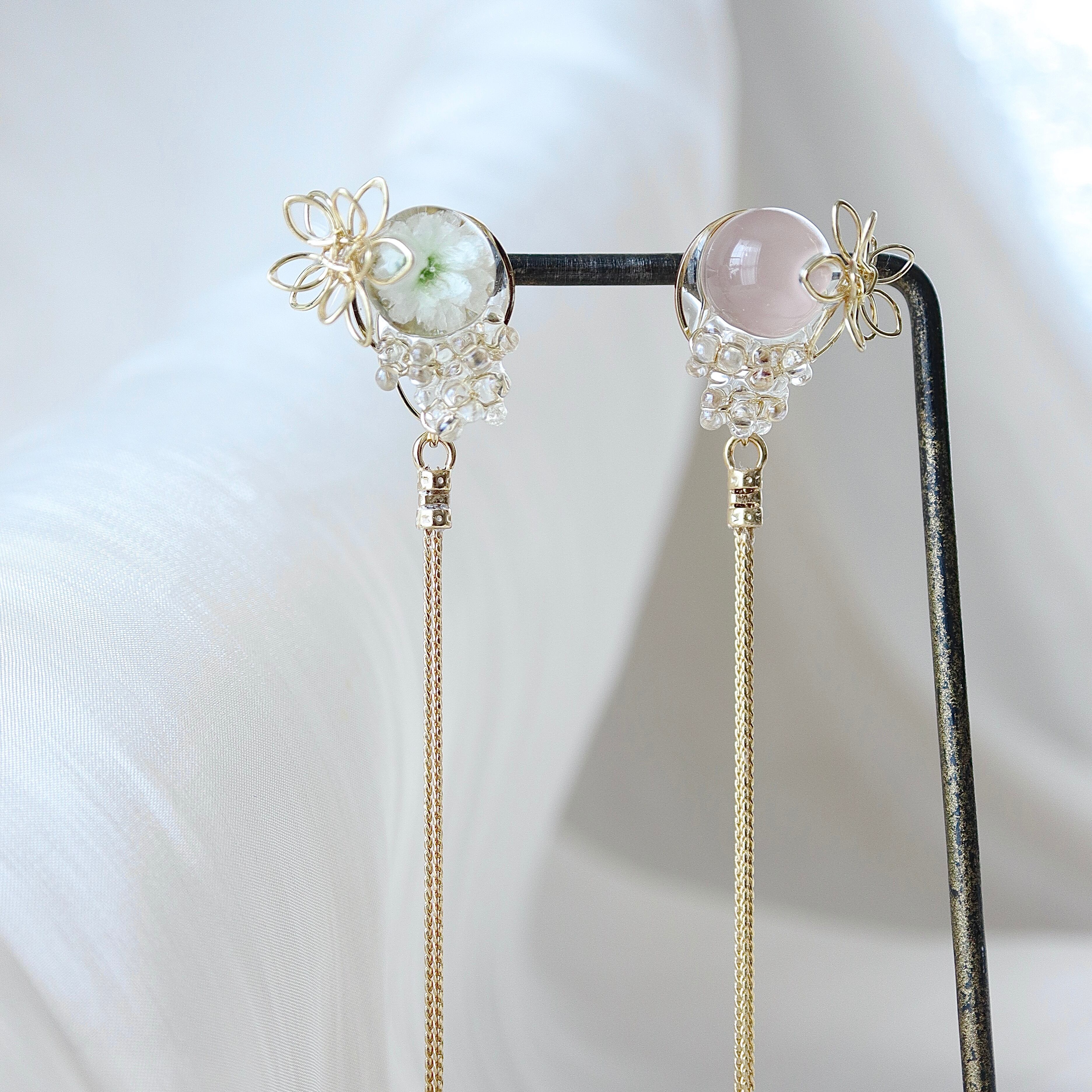 【柔らかなさくらピンク】2way ワイヤーフラワーとチェーンタッセルピアス(イヤリング